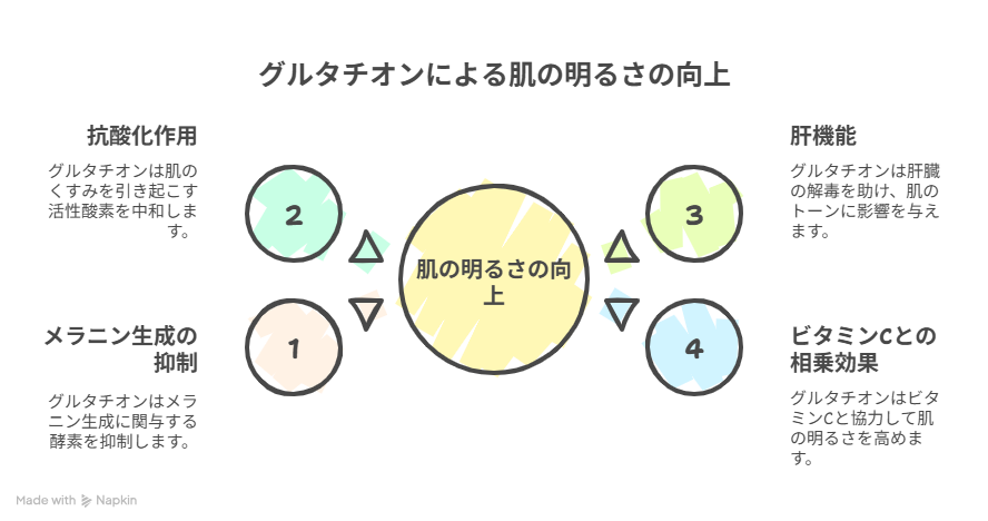 肝臓で働くグルタチオンが体内の毒素を処理し、血色や肌の明るさに間接的に影響するという説も。