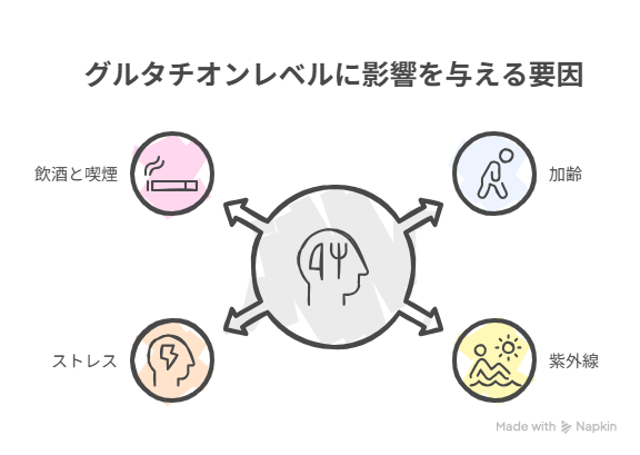 以下の要因で、グルタチオンの体内レベルは低下します: